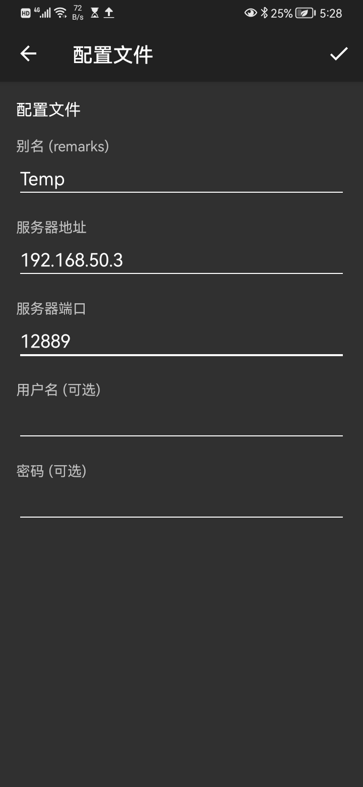 “别名”随便填,“服务器地址”填电脑的IP地址,“端口”填12889,其它留空